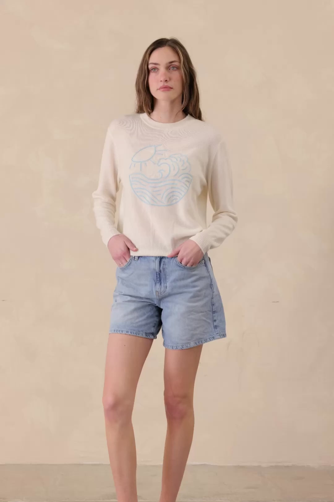 Sumérgete en un mundo de inspiración artística con Jodie. Eleve su guardarropa con este jersey de cuello redondo, manga larga y ajuste relajado, cuidadosamente diseñado para combinar comodidad con un toque de expresión creativa. Jodie presenta un cautivador gráfico bordado con ondas que agrega una dimensión única y artística a tu conjunto. Confeccionado con meticulosa atención al detalle, este suéter combina a la perfección una silueta de ajuste relajado con un diseño imaginativo, lo que lo convierte en una opción imprescindible para quienes valoran tanto la comodidad como una declaración de moda distintiva en su vestimenta diaria.